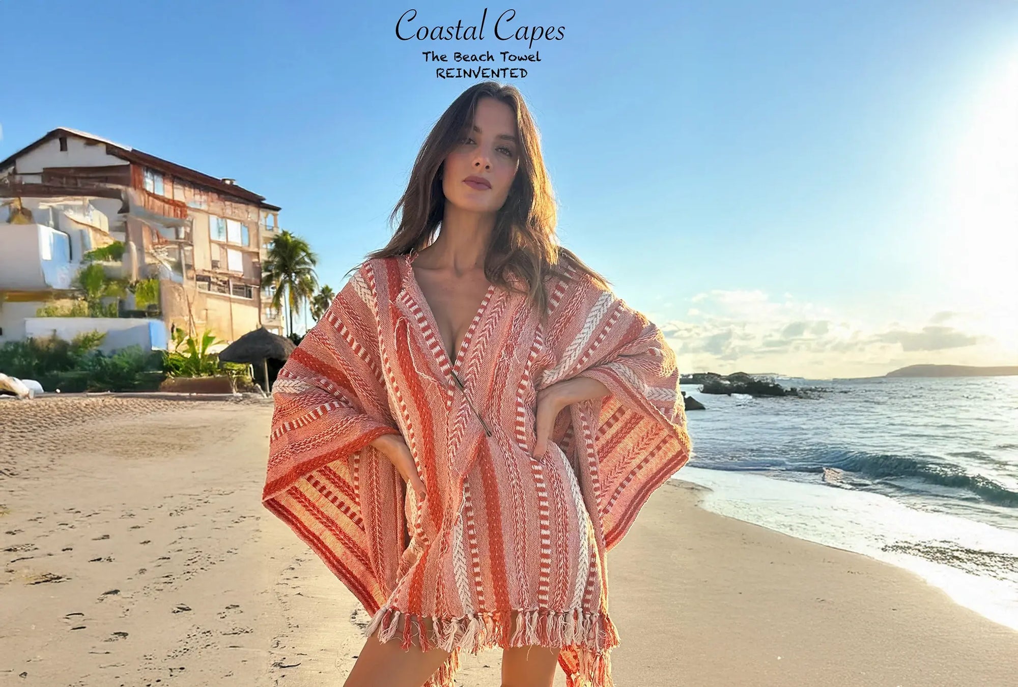 These amazing designs are as fashionable as they are functional. Our Coastal capes are made of the highest quality fabrics to ensure light weight coverage that absorb water to double as your beach towel. Wear them on the beach as a luxurious fashion statement. Take them on the boat for a cozy cover up. Show your style at happy hour, bonfires, and restaurants in these fashion forward frocks! One size fits most with our gorgeous oversized pin for the perfect adjustment. Tag us on instagram @edaandbetty to show us your personal styling.